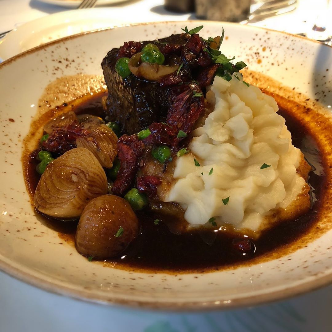 First you eat with your eyes. Pictured is a dinner from Montrio Bistro in Monterey. Braised Boneless Prime Angus Beef Short Rib with Whipped Potatoes, Pearl Onions, House Dried Tomatoes for about $40.
